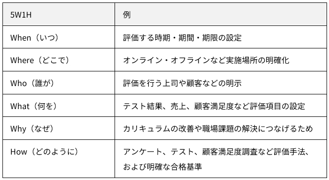 このように5W1Hで視点を具体化することで、評価までの道筋が明確になります。