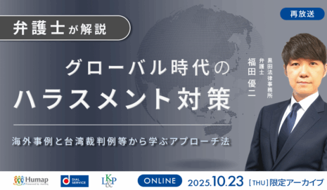 【動画セミナー】弁護士が解説!グローバル時代のハラスメント対策:海外事例と台湾裁判例等から学ぶアプローチ法~10/23(木)