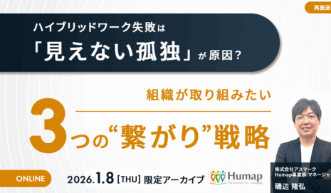 【動画セミナー】ハイブリッドワーク失敗は「見えない孤独」が原因?組織が取り組みたい、3つの繋がり戦略~1/8(木)