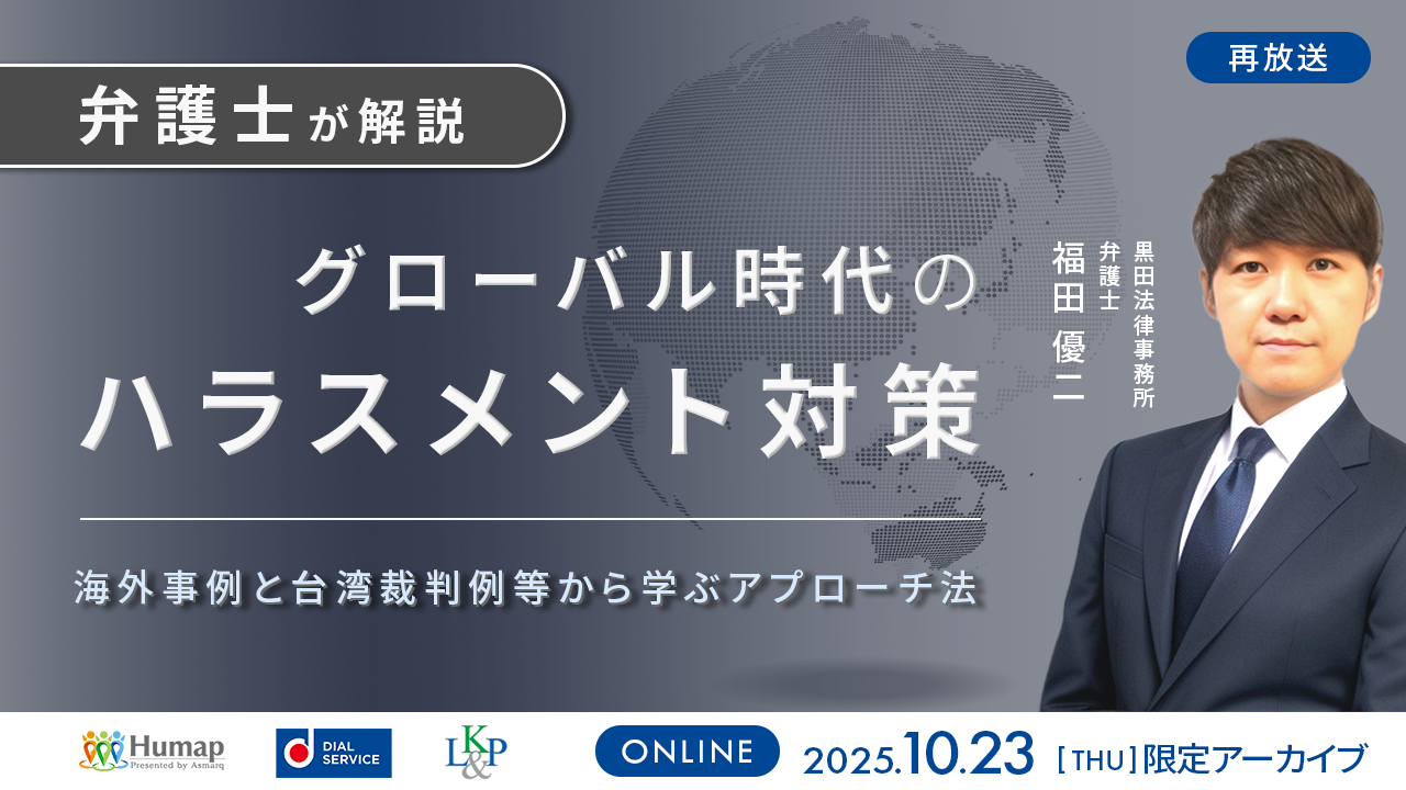 本セミナーは、弁護士が登壇し、各国におけるハラスメント規定といった基礎知識から、台湾を中心とした海外のハラスメント事例、そして組織が講じるべき措置まで具体的に解説。