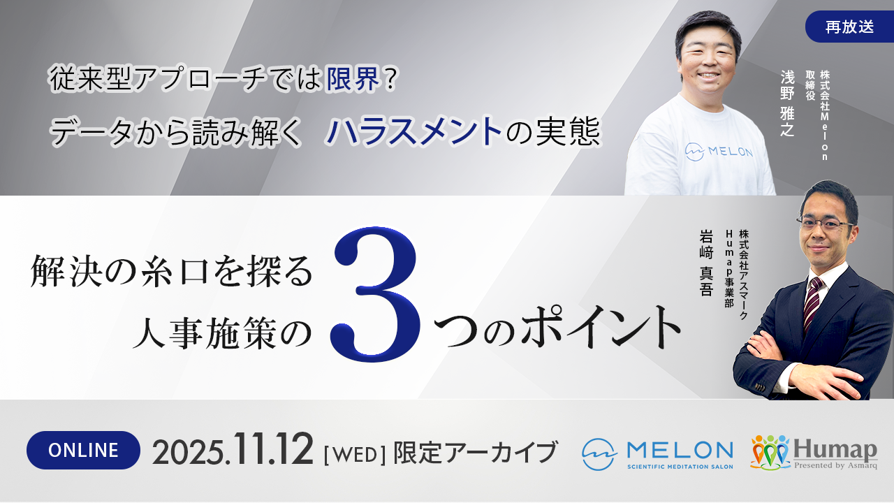 本セミナーでは、Humapが最新データの解説に加え、データを活用した現状把握や効果測定の具体的な手法を紹介し、Melonからは、個別性を重視した施策設計、心理的安全性を高めるアプローチや継続的にケアできる仕組みづくりについて解説します。