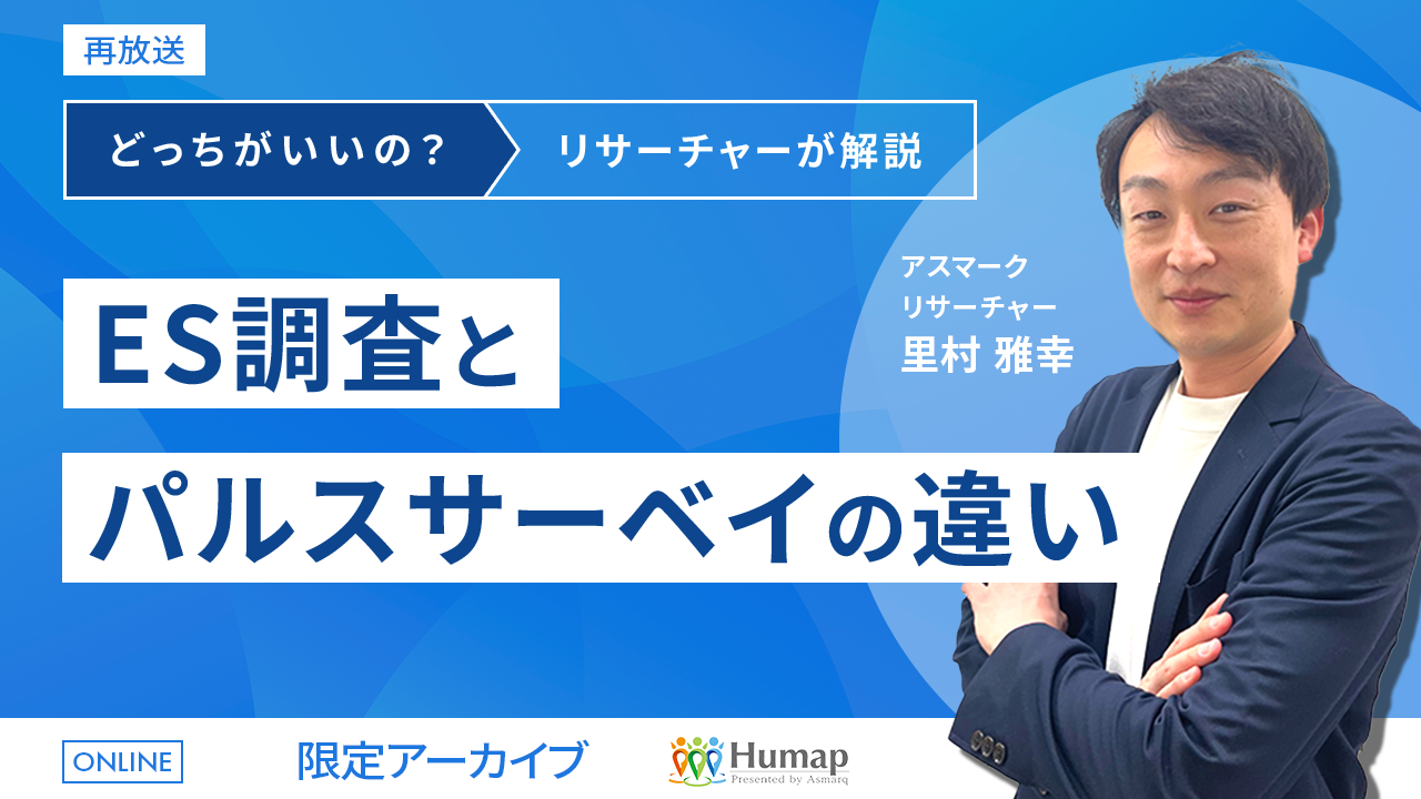 そこでこのセミナーでは、調査歴20年以上のアスマークの中でも、HRに関する調査を年20本以上実施するリサーチャーが登壇。「ES調査」と「パルスサーベイ」の違いや、各調査手法のメリットデメリットから、自社に合う調査手法を選ぶポイントを解説します。