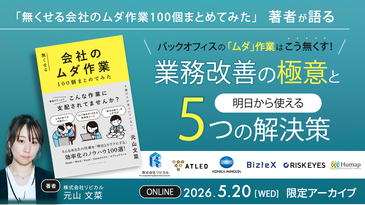【動画セミナー】バックオフィスの「ムダ作業」はこう無くす!~『無くせる会社のムダ作業100個まとめてみた』著者が語る業務改善の極意と、明日から使える5つの解決策~5/20(水)